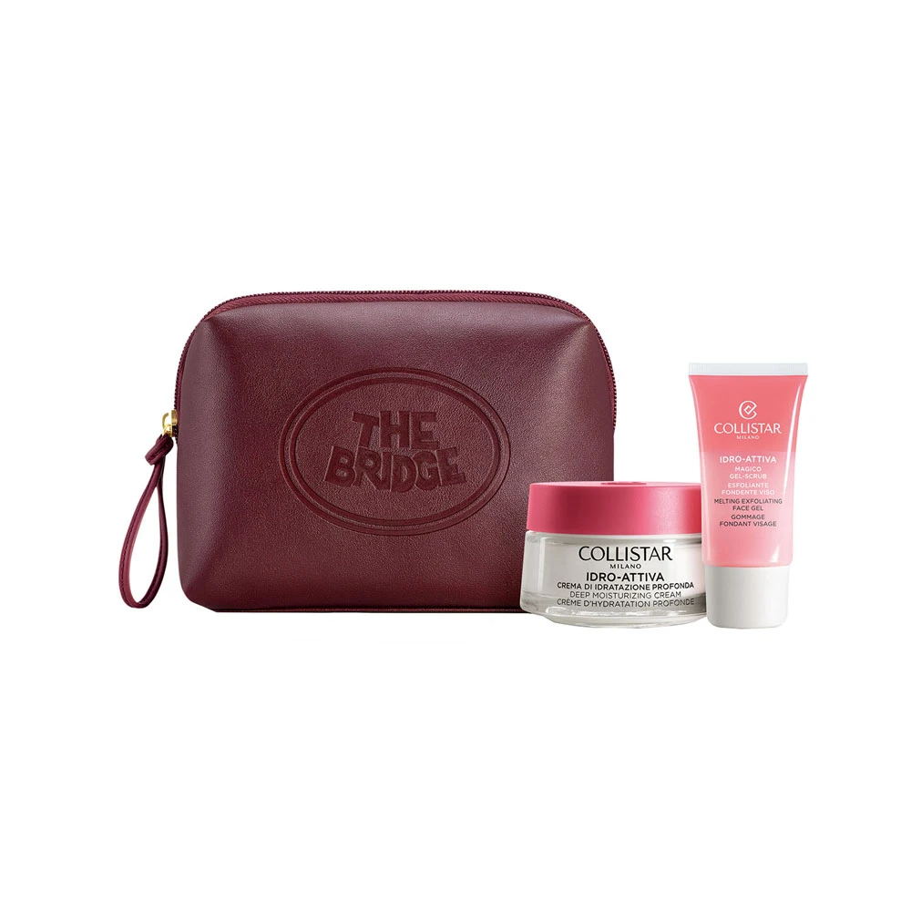 La confezione comprende il 50 ml Hydro-Attiva Crema di Idratazione Profonda, il 5 ml Hydro-Gel Contorno Occhi Effetto Ghiaccio e la Beauty Bag The Bridge.