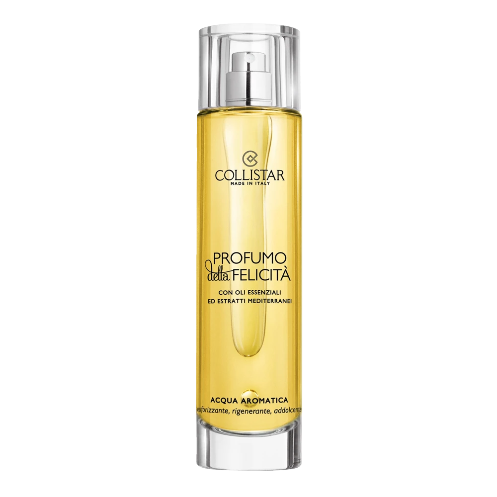 A queste emozioni e sensazioni Collistar dedica Profumo della Felicità, Acqua Aromatica per il Corpo, un inno alla gioia di vivere e alla femminilità più radiosa e piena. Un esordio di note frizzanti di pompelmo e mandarino, unite alla soavità di un cuore di fior di loto, alle nuances vellutate della peonia ed illuminate dal pepe rosa e dal ribes. Il fondo diventa avvolgente come un abbraccio, con le seducenti note di osmanthus e la raffinatezza di vetiver e musk.