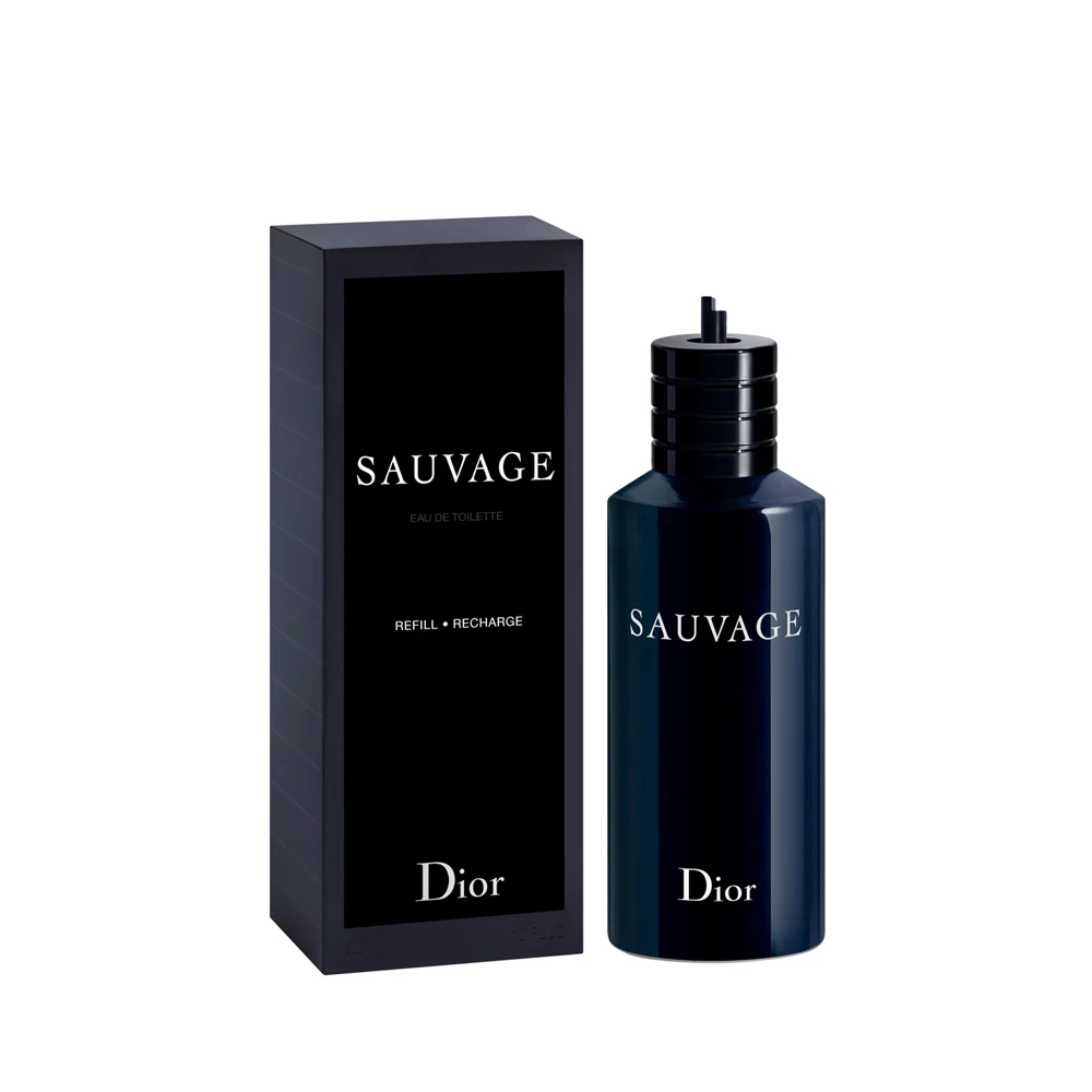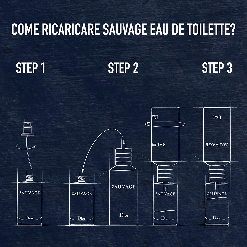Ricarica il tuo flacone di eau de toilette Sauvage da 100 ml e 30 ml che riporta l’indicazione “RECHARGEABLE” sul retro (eau de toilette 30 ml) o sotto il flacone (eau de toilette 100 ml) con la ricarica da 300 ml di Sauvage.