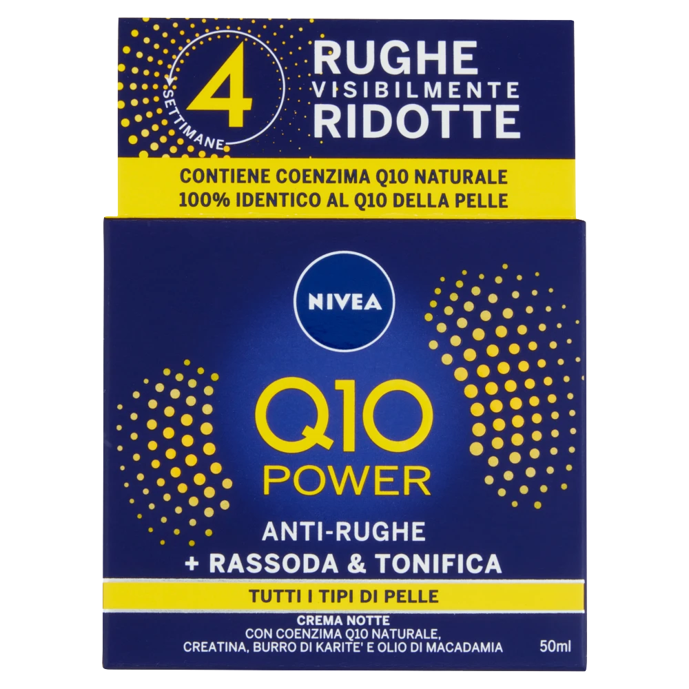 Risultati: rughe visibilmente ridotte e pelle rigenerata per una pelle levigata e piu giovane. Agisce in armonia con la tua pelle: il Q10 e la Creatina sono potenti attivi naturalmente presenti nell’epidermide. Con l’eta il loro livello diminuisce e la pelle ha meno energia per rigenerarsi. La gamma Nivea Q10 Plus utilizza coenzima Q10 e Creatina, ingredienti naturalmente presenti nell’epidermide, in formule avanzate che agiscono efficacemente contro le rughe in perfetta armonia con la pelle.