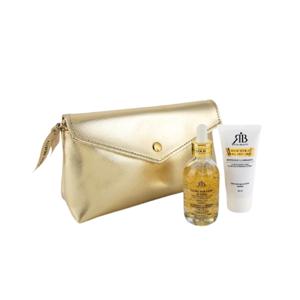 Una preziosa pochette dorata e super elegante con all’interno due prodotti must-have di Royal Beauty: